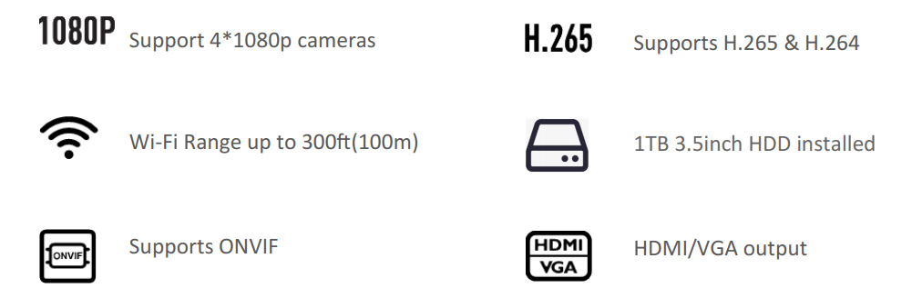 • 8 Channel X5S-4W + 1080p C3WN (2.8mm) × 4 + 1TB 3.5 inch HDD