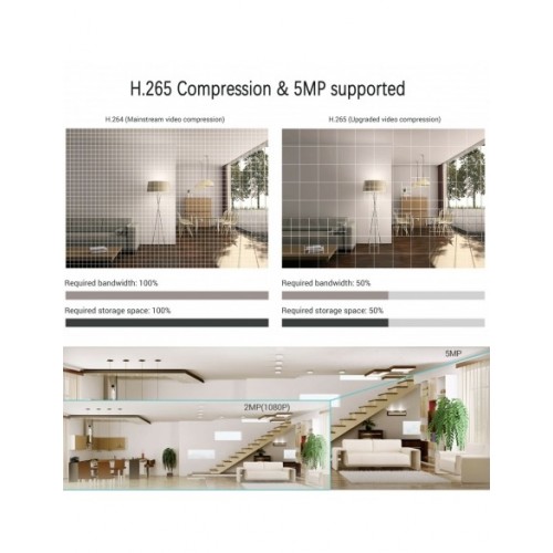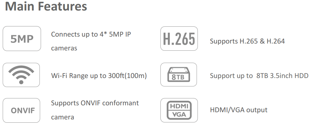 The X5S is EZVIZ wireless NVR with HDMI and VGA ports that supports up to 4*5MP IP cameras and conforms to the ONVIF standard. It also features H.265  video compression standard and up to 8TB storage.